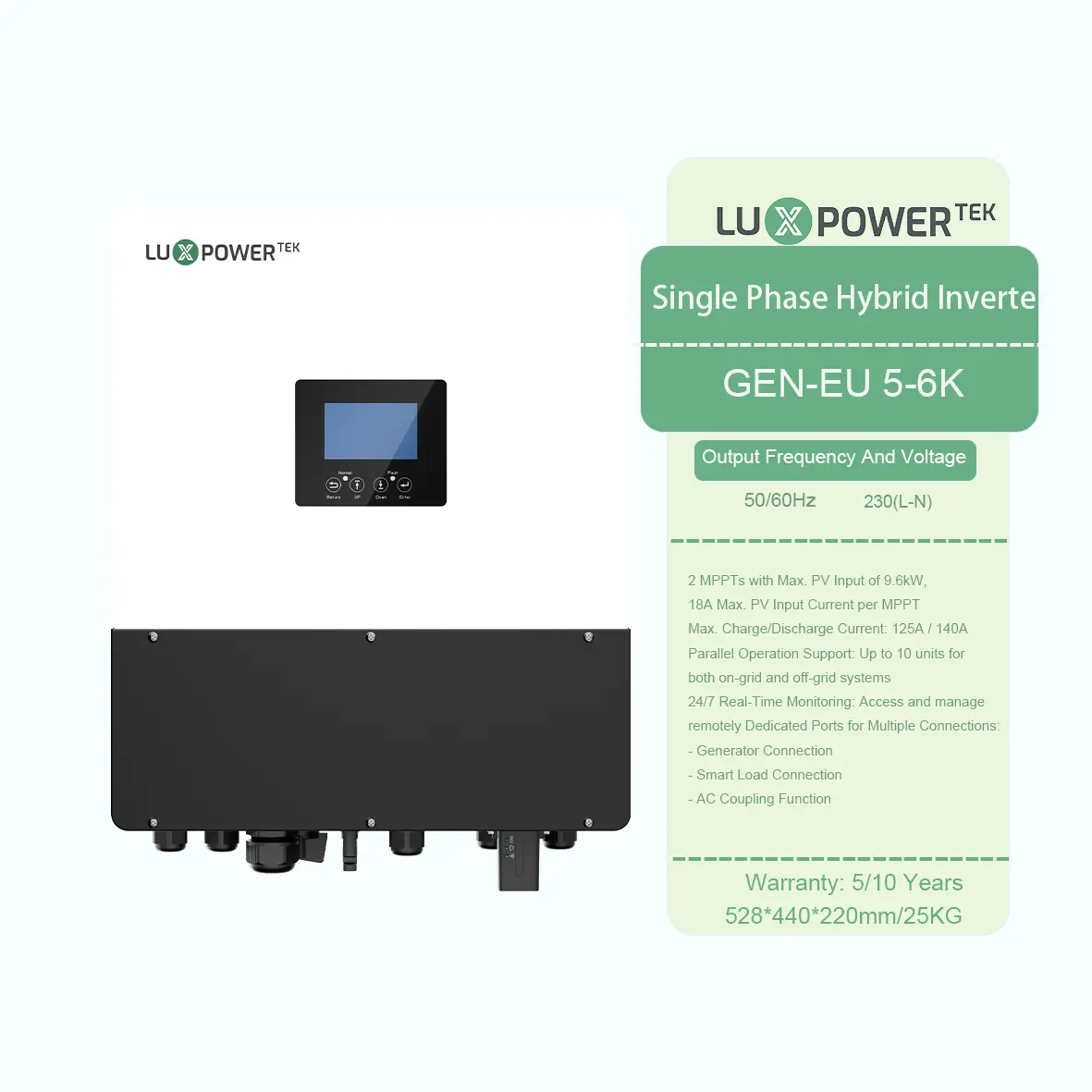 Luxpower terbaru Gen2-lb-EU 3-6K adalah peningkatan langsung kepada Gen-LB-EU 3-6K, menyampaikan prestasi dan daya tahan yang unggul. Mempunyai pelacak MPPT dwi, ia memaksimumkan tuaian solar dengan input PV max 9.6kW. Setiap MPPT menyokong 18A, beroperasi dengan cekap merentasi julat input 100-530V yang luas.