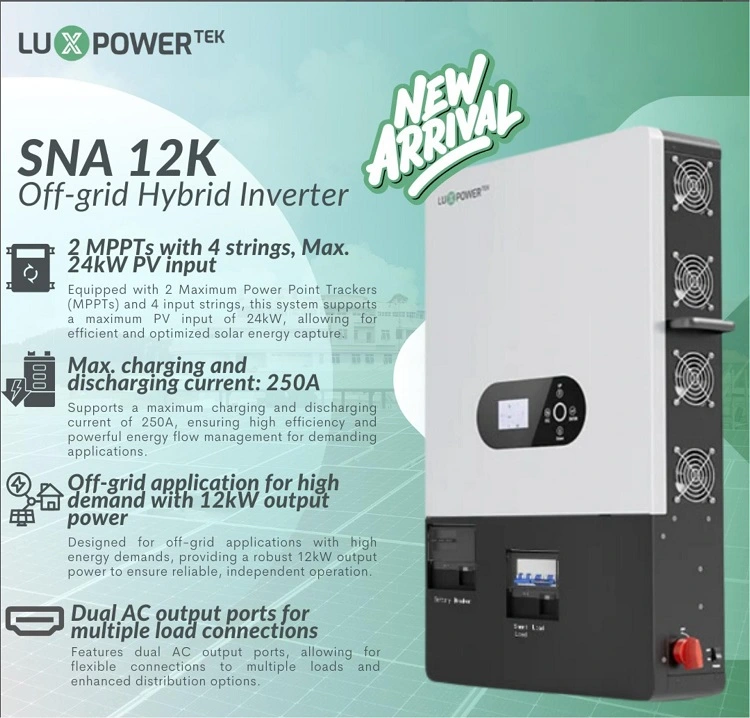 Luxpower Terbaik Terkini Dalam Penyelesaian Kuasa Luar Grid, Model Luxpower SNA-EU 12000 Sunlink, menyampaikan output kuasa yang mantap 12kW. Direka untuk kebolehpercayaan dan fleksibiliti, ia menyediakan pengurusan tenaga yang lancar di pelbagai aplikasi.