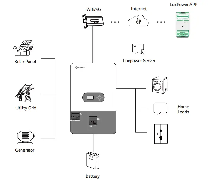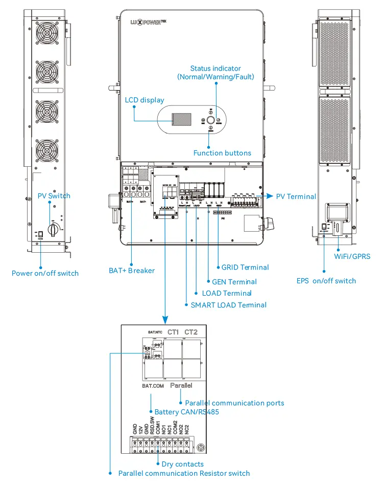 Reka bentuk modularnya menyokong sambungan selari sehingga 16 unit, menyediakan skalabilitas yang dipertingkatkan untuk memenuhi keperluan tenaga yang pelbagai. Dilengkapi dengan pelabuhan beban bebas yang menyokong beban separuh gelombang, ia menunjukkan keupayaan yang luar biasa dalam mengendalikan pelbagai keperluan beban. Luxpower SNA-EU 12000 mempunyai keupayaan lulus 100A dan port penjana yang berdedikasi, yang membolehkan integrasi lancar dengan sistem grid sedia ada.