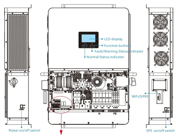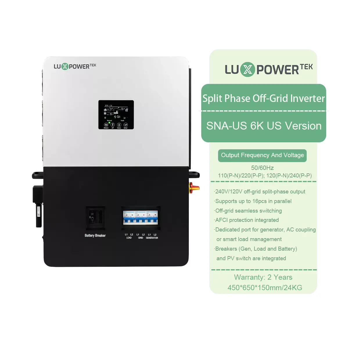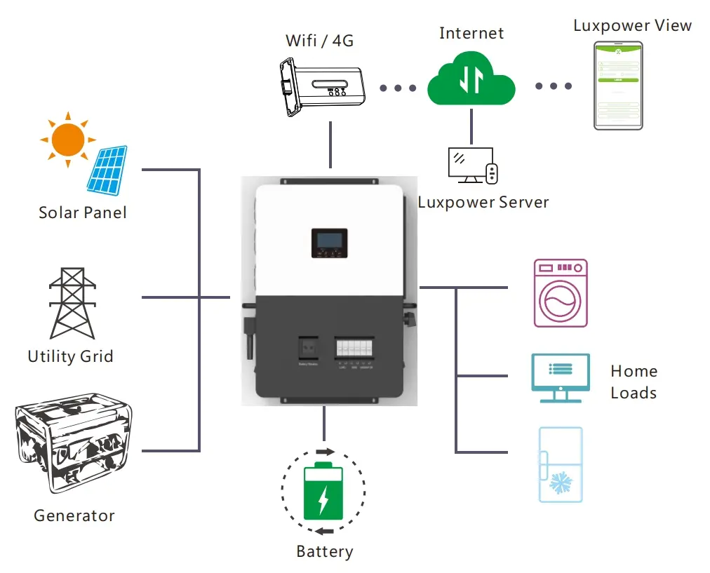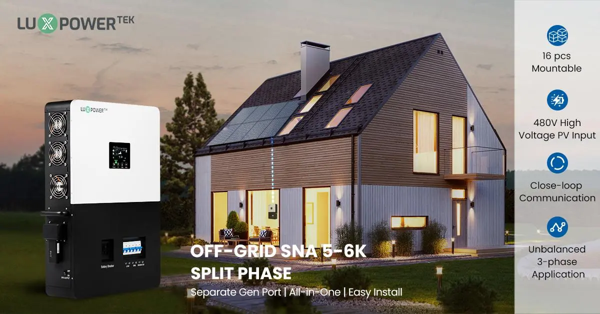 Direka untuk penyimpanan tenaga luar grid, Luxpower SNA US 6000 mempunyai antara muka penjana khusus dan antara muka EPS dengan kuasa output 6kW.